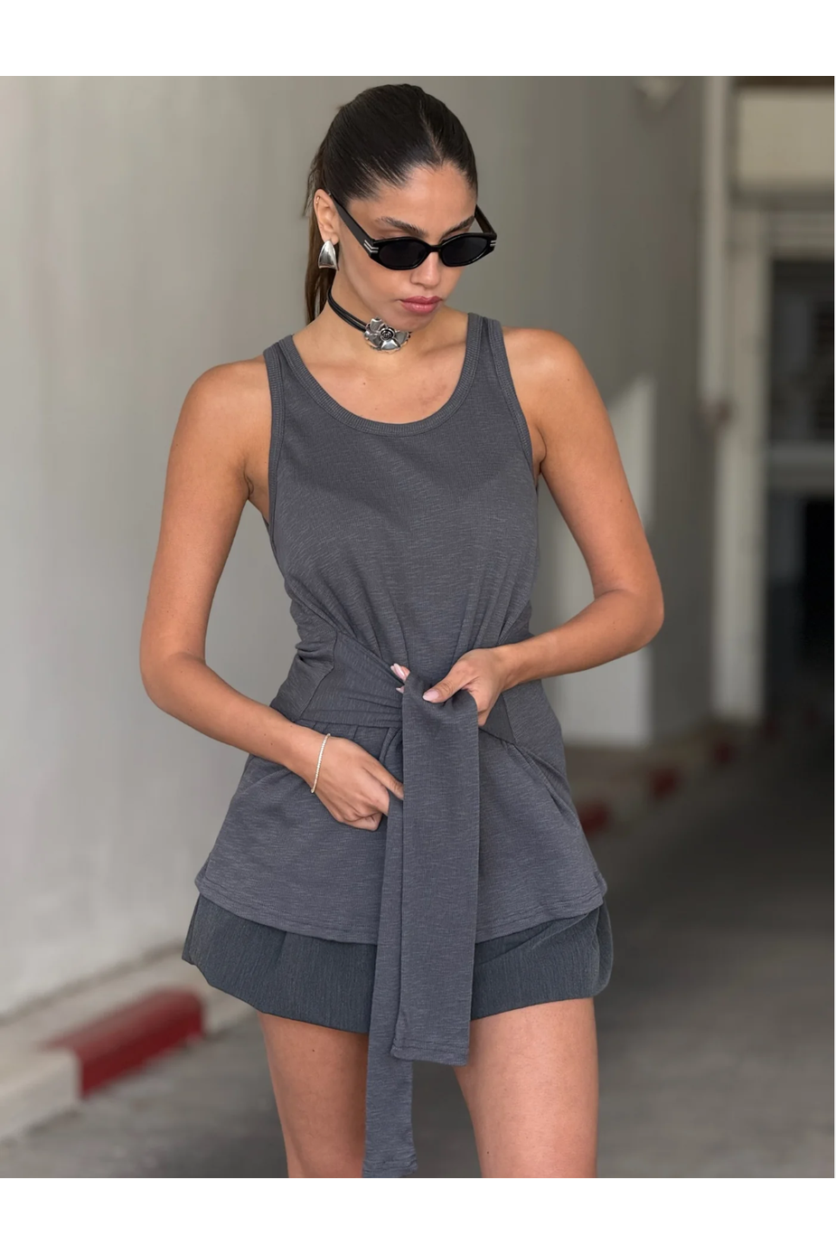 גופיית אוניל בצבע אפור, עשויה 100% כותנה, בעלת חגורת קשירה שמוסיפה למראה האלגנטי והנעים.